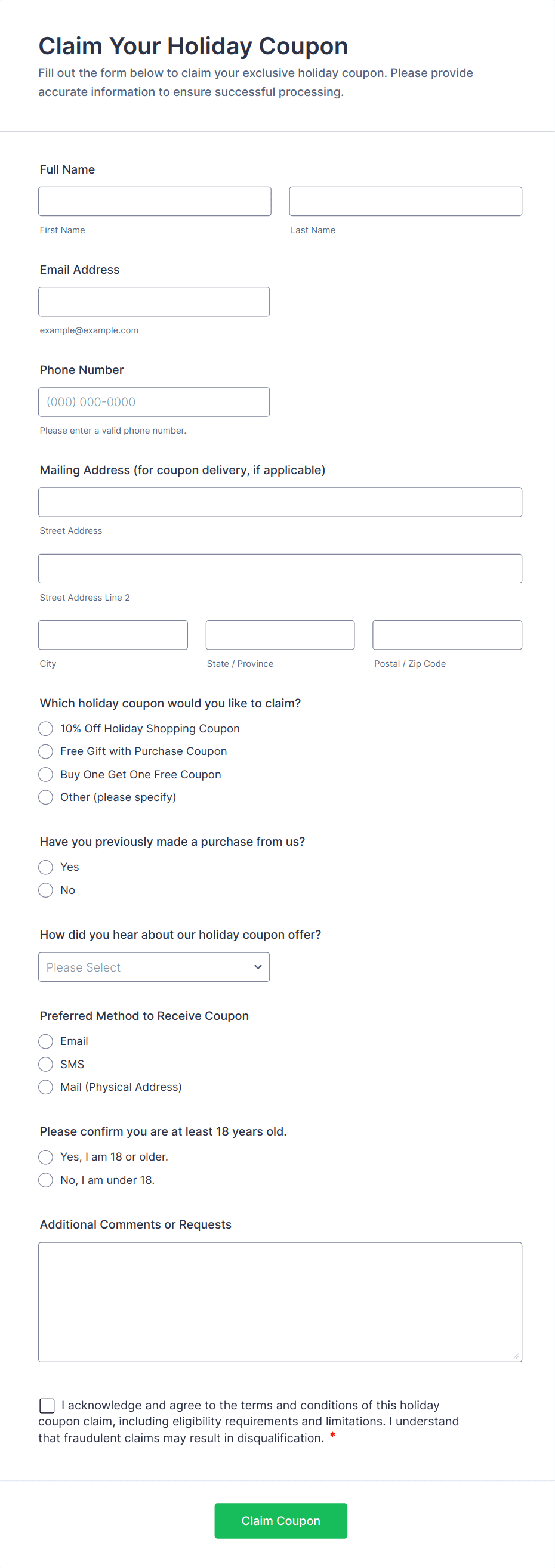 Collect accurate holiday mailing details for cards, gifts, and seasonal deliveries with the Holiday Address Collection Form by Jotform, ideal for families, nonprofits, and businesses that need fast online data collection.