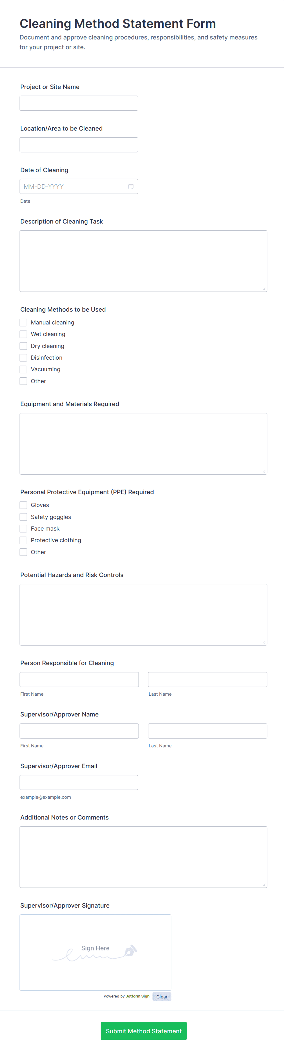 Cleaning Forms are specialized digital forms designed to streamline and organize the processes involved in cleaning services, facility maintenance, and janitorial operations. These forms can be used for a variety of purposes, such as scheduling cleaning appointments, conducting cleaning inspections, tracking supply usage, logging completed tasks, and collecting client feedback. Whether you manage a commercial cleaning company, oversee in-house custodial teams, or offer residential cleaning services, Cleaning Forms help ensure that all tasks are documented, standards are met, and communication between staff and clients remains clear and efficient.