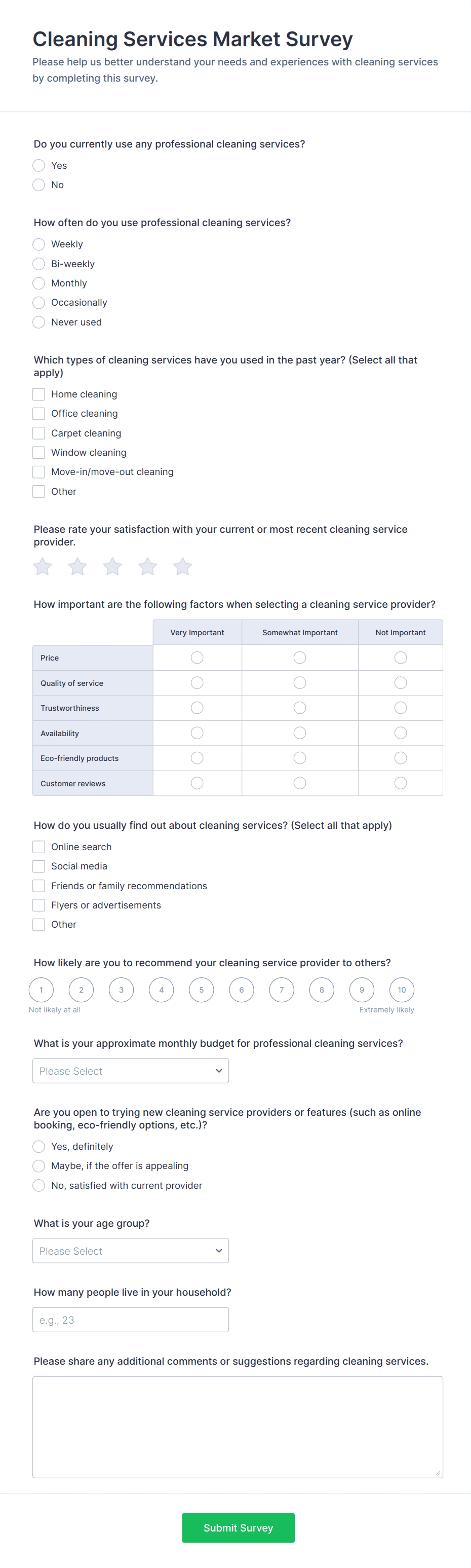 Cleaning Forms are specialized digital forms designed to streamline and organize the processes involved in cleaning services, facility maintenance, and janitorial operations. These forms can be used for a variety of purposes, such as scheduling cleaning appointments, conducting cleaning inspections, tracking supply usage, logging completed tasks, and collecting client feedback. Whether you manage a commercial cleaning company, oversee in-house custodial teams, or offer residential cleaning services, Cleaning Forms help ensure that all tasks are documented, standards are met, and communication between staff and clients remains clear and efficient.