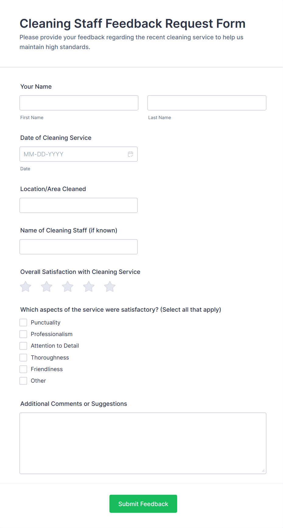 A Cleaning Form is a digital document used to organize, track, and manage cleaning tasks, appointments, inspections, and feedback within cleaning services or facility maintenance operations.