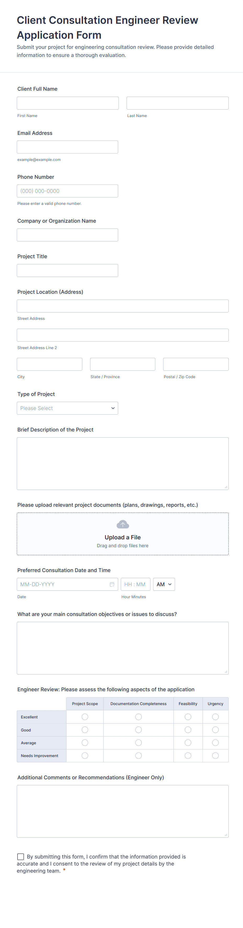 An engineer form is a digital document used by engineering professionals to collect, record, and manage project-related data such as inspections, maintenance, progress reports, and compliance checklists.