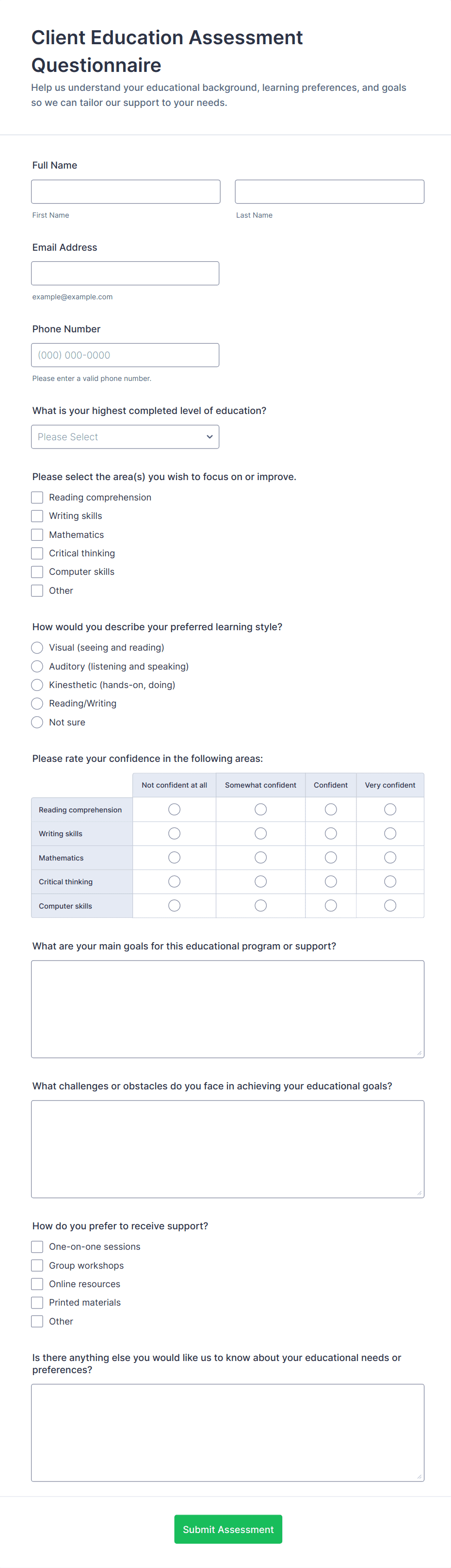 A Client Questionnaire is a form template designed to streamline the process of collecting vital information from clients, including their details, goals, and expectations