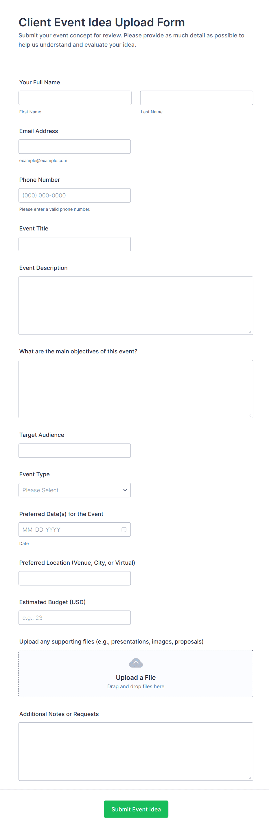 Include location preferences, room setup, catering, AV, staffing, and any vendor details. Add file uploads for agendas or quotes.