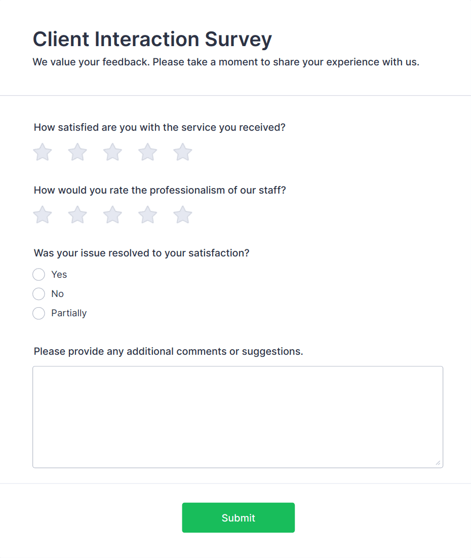 • For customer satisfaction surveys, include Net Promoter Score (NPS) fields or star ratings.
