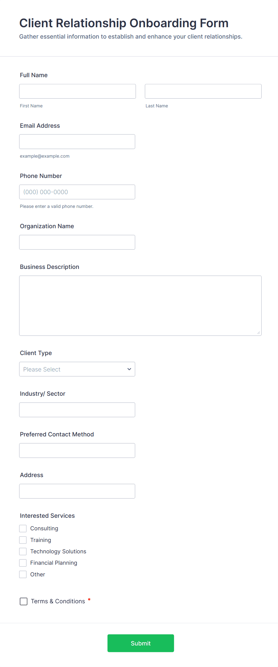 - Client onboarding: Focuses on business information, service requirements, and contract agreements.