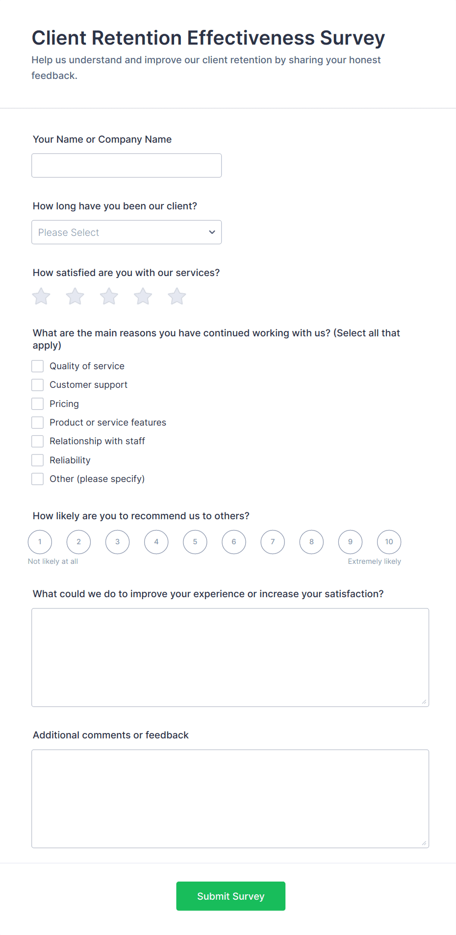 • For employee or patient surveys, add questions about environment, staff, and overall experience.