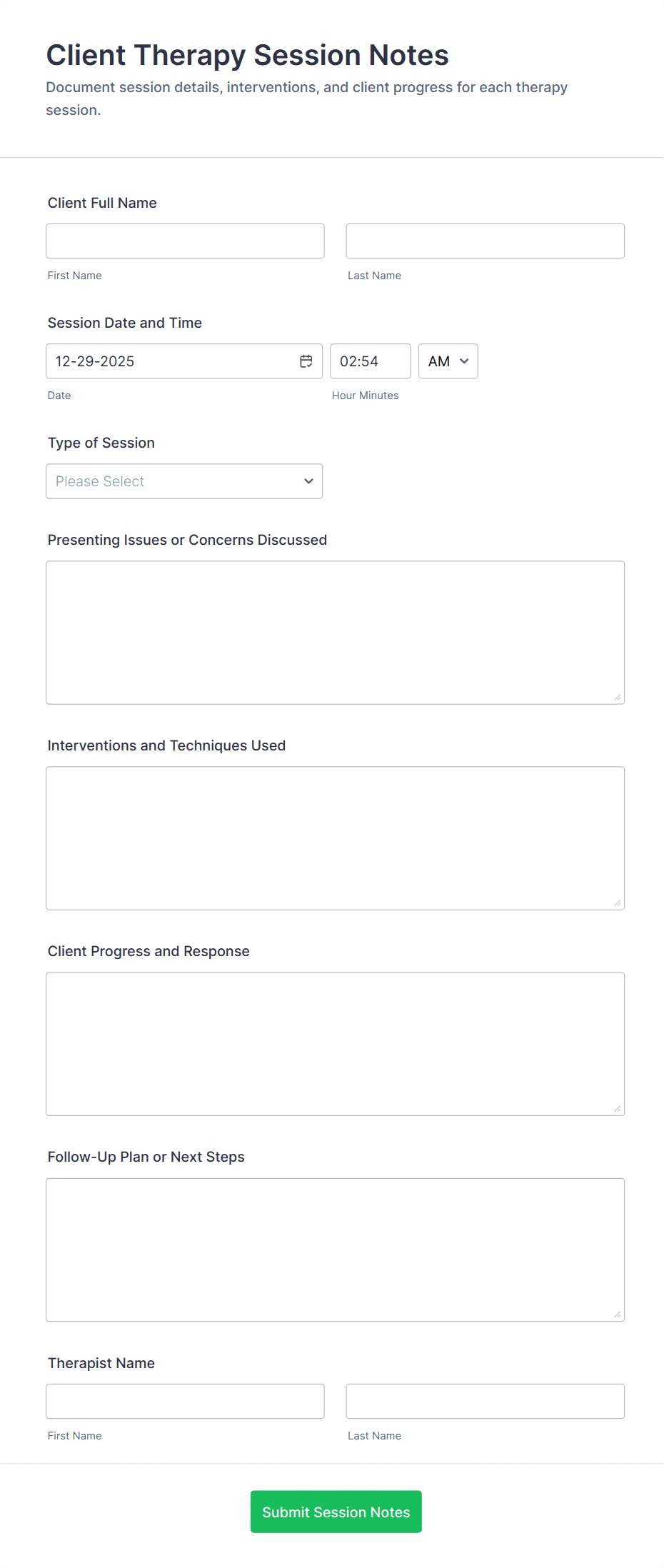 Absolutely. Forms can be tailored for specialties such as child therapy, couples counseling, addiction treatment, or group therapy by adjusting fields and content.