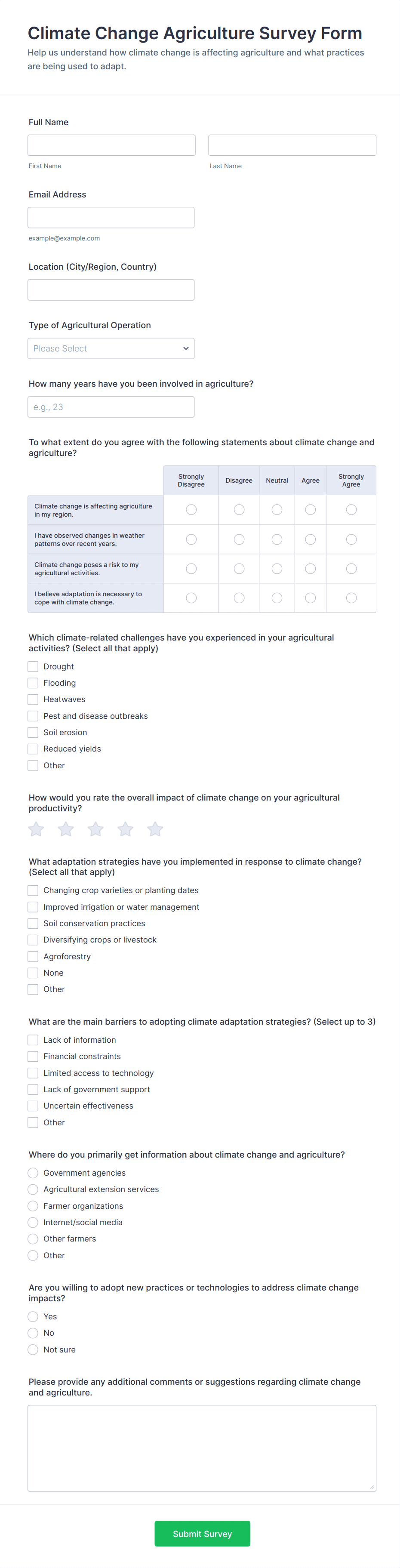 An Agriculture Survey is a form used by farmers and their representatives to collect data about their farms and land. Easy to use. No coding.