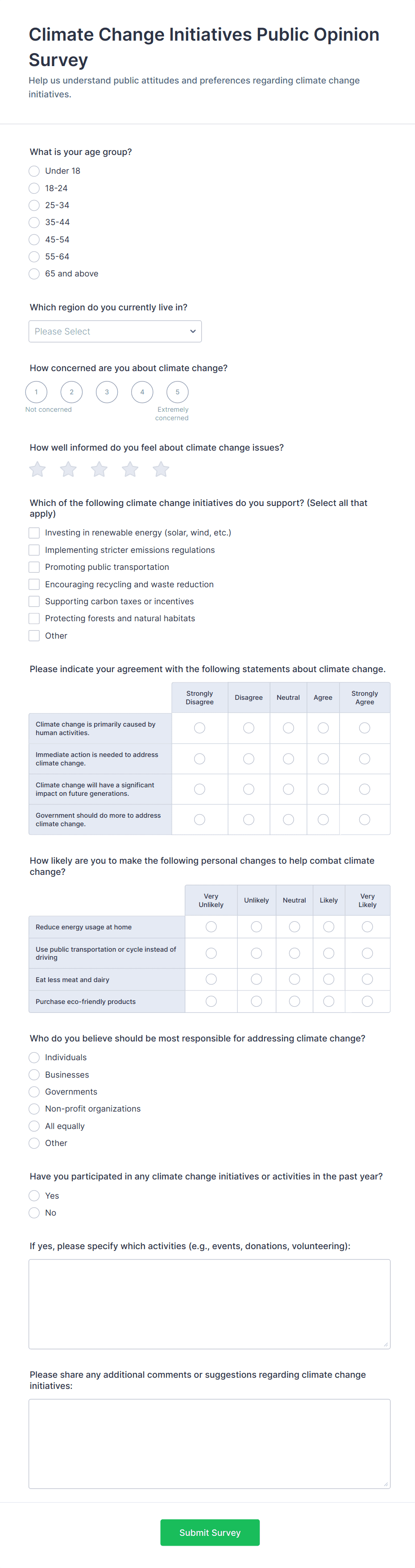 A Website Survey is a form template designed to collect visitors' feedback effortlessly. It's perfect for website owners or developers seeking to improve user experience and site functionalities. This intuitive tool saves time, aids in decision-making and enhances customer satisfaction.