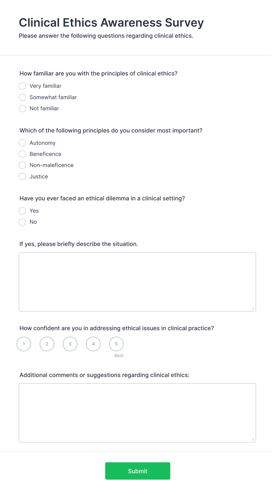 Medical surveys and questionnaires are essential tools used by healthcare professionals, researchers, clinics, and organizations to collect valuable information about patients’ health, medical histories, symptoms, treatment outcomes, and overall well-being. These forms can be used for a variety of purposes, such as patient intake, health risk assessments, satisfaction surveys, mental health screenings, post-visit feedback, and clinical research studies. By gathering structured data directly from patients or study participants, medical surveys and questionnaires help streamline workflows, improve patient care, and support evidence-based decision-making in healthcare settings.