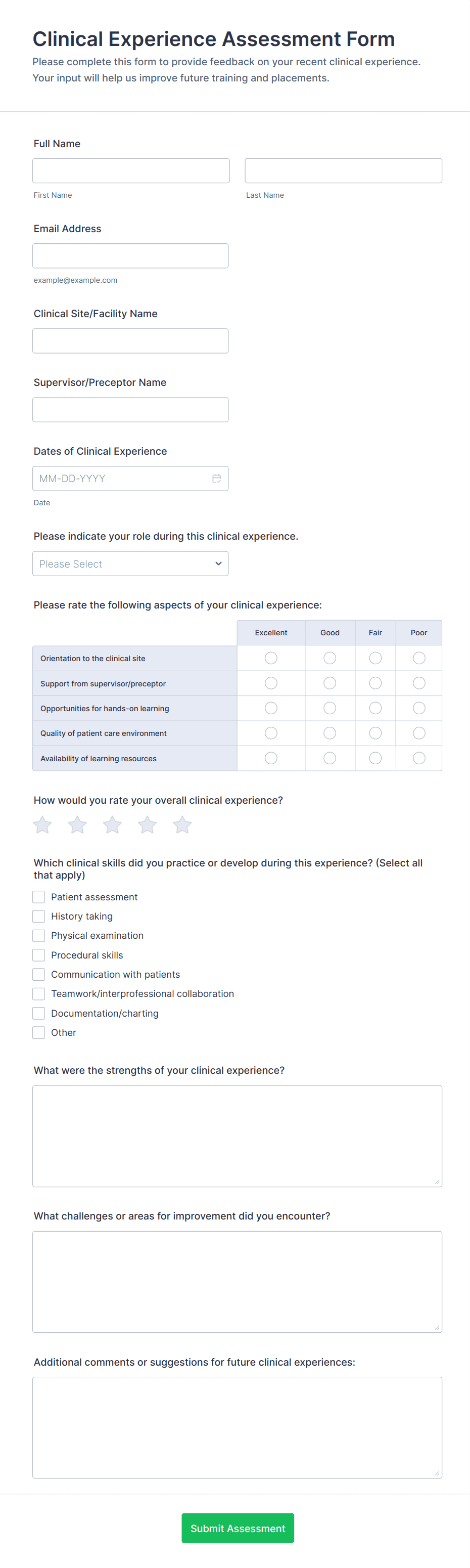 Healthcare assessment forms are structured documents used to collect and evaluate patient health information to support clinical decisions, care planning, and ongoing monitoring. They help healthcare teams capture consistent details about symptoms, medical history, risk factors, functional status, and care needs in a clear and organized way. Healthcare assessment forms are commonly used in clinics, hospitals, telehealth services, rehabilitation centers, home care, and specialty practices for intake assessments, screening evaluations, follow-up check-ins, and condition monitoring. By standardizing assessment workflows, these forms improve documentation quality, reduce missing information, and support safer, more coordinated care.