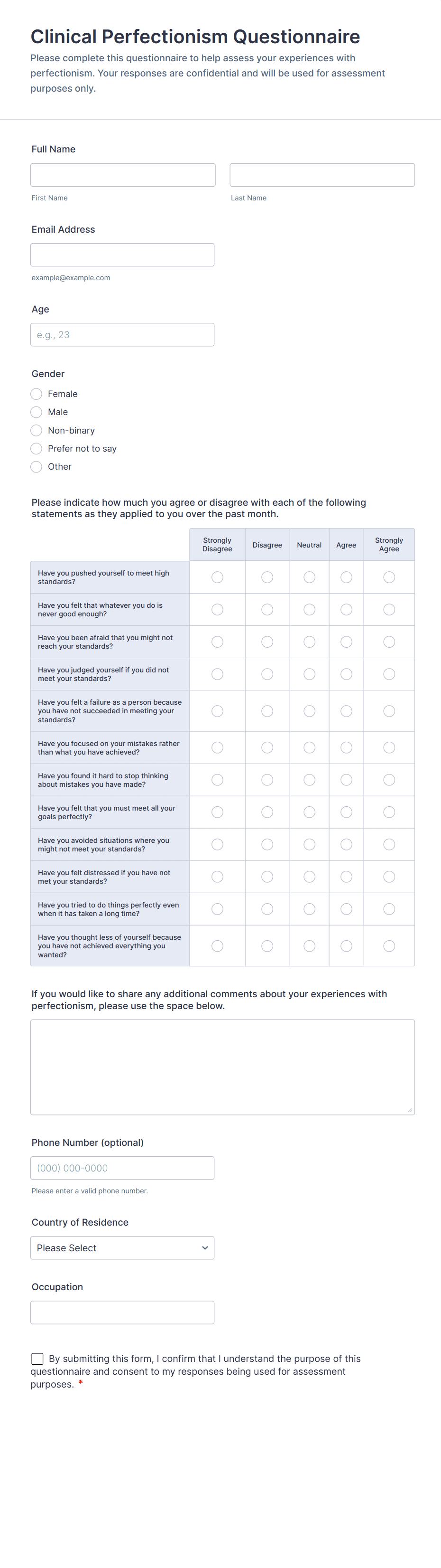 - Research Questionnaires: Require consent forms, demographic data, and study-specific queries.