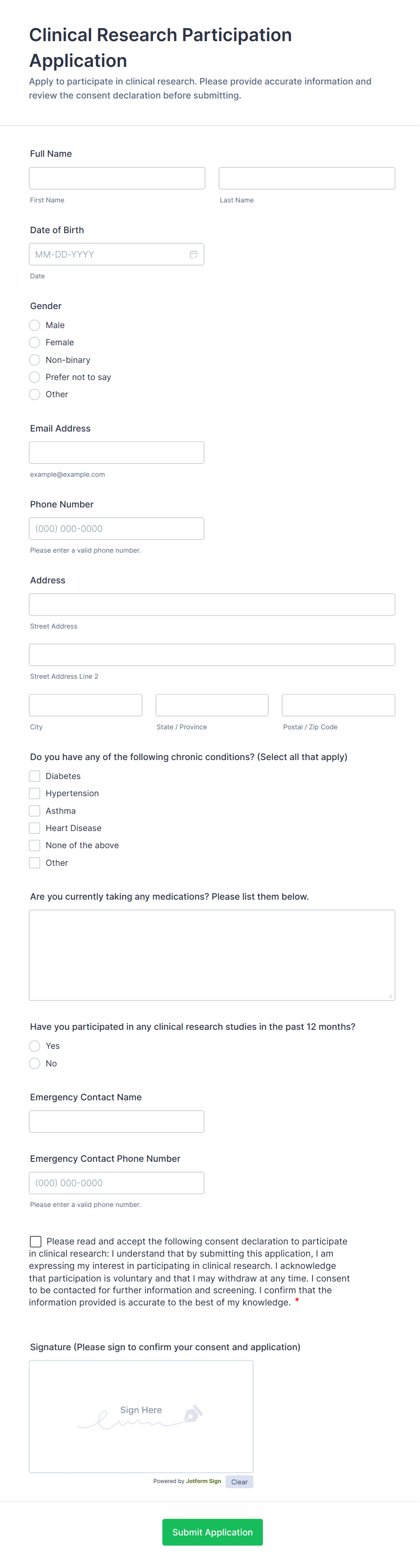 • For medical or research forms, include additional fields for emergency contacts, health history, or specific legal disclosures.