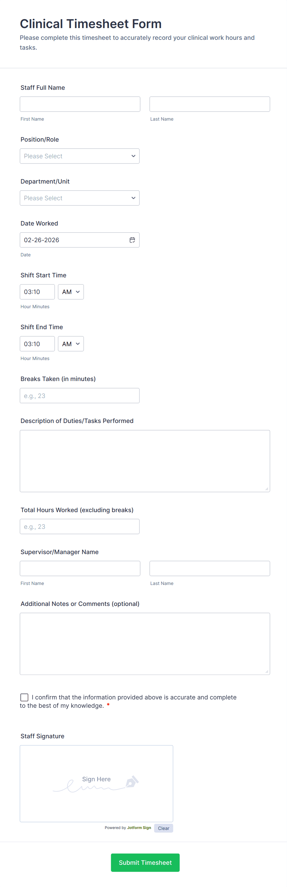 Time Tracking Forms are specialized digital tools designed to help individuals and organizations monitor and record the amount of time spent on various tasks, projects, or activities. These forms are commonly used in workplaces to track employee hours, manage project timelines, monitor billable hours for clients, or even log volunteer or student participation. Time tracking forms can be tailored for a wide range of scenarios, from simple daily timesheets to more complex project-based tracking, making them essential for businesses, freelancers, educators, and nonprofit organizations seeking to improve productivity, accountability, and transparency.