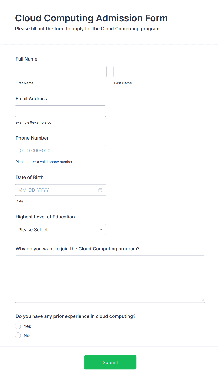 • For specialized use cases, include fields for document uploads (e.g., transcripts, immunization records) or payment collection (for tuition or registration fees).