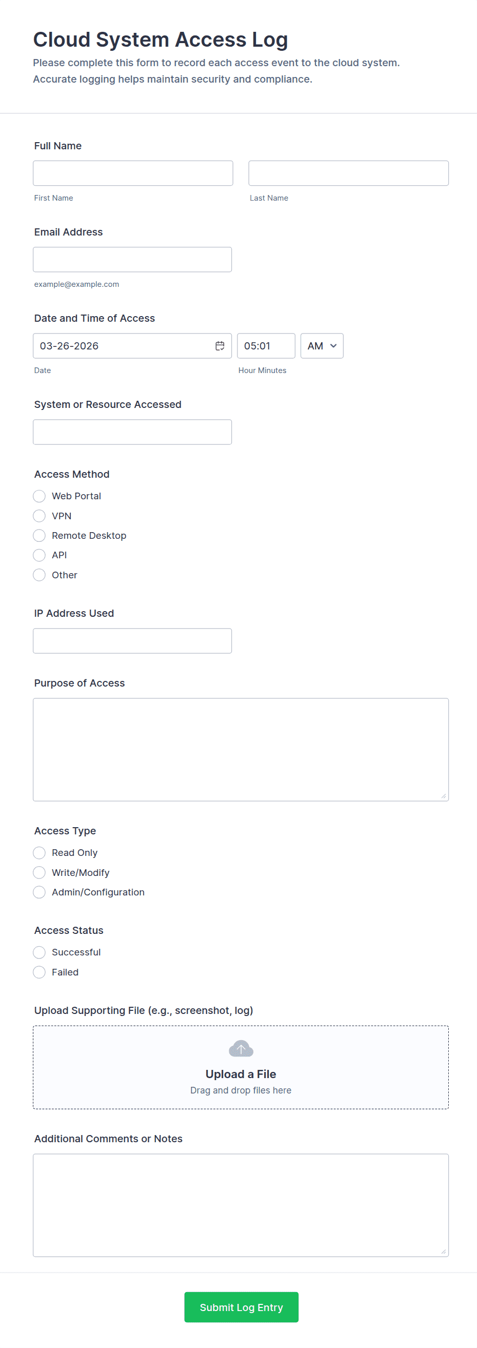 Access control forms are structured documents used to request, approve, and document access to physical locations, systems, or restricted resources. They help organizations manage who can enter certain areas, use specific equipment, or access sensitive digital systems by collecting consistent details such as requester identity, access level, justification, and approval records. Access control forms are commonly used in offices, campuses, data centers, hospitals, warehouses, and IT environments for badge requests, visitor access, temporary passes, role-based system access, and permission changes. By standardizing access requests, these forms reduce security risks, improve accountability, and create clear audit trails.