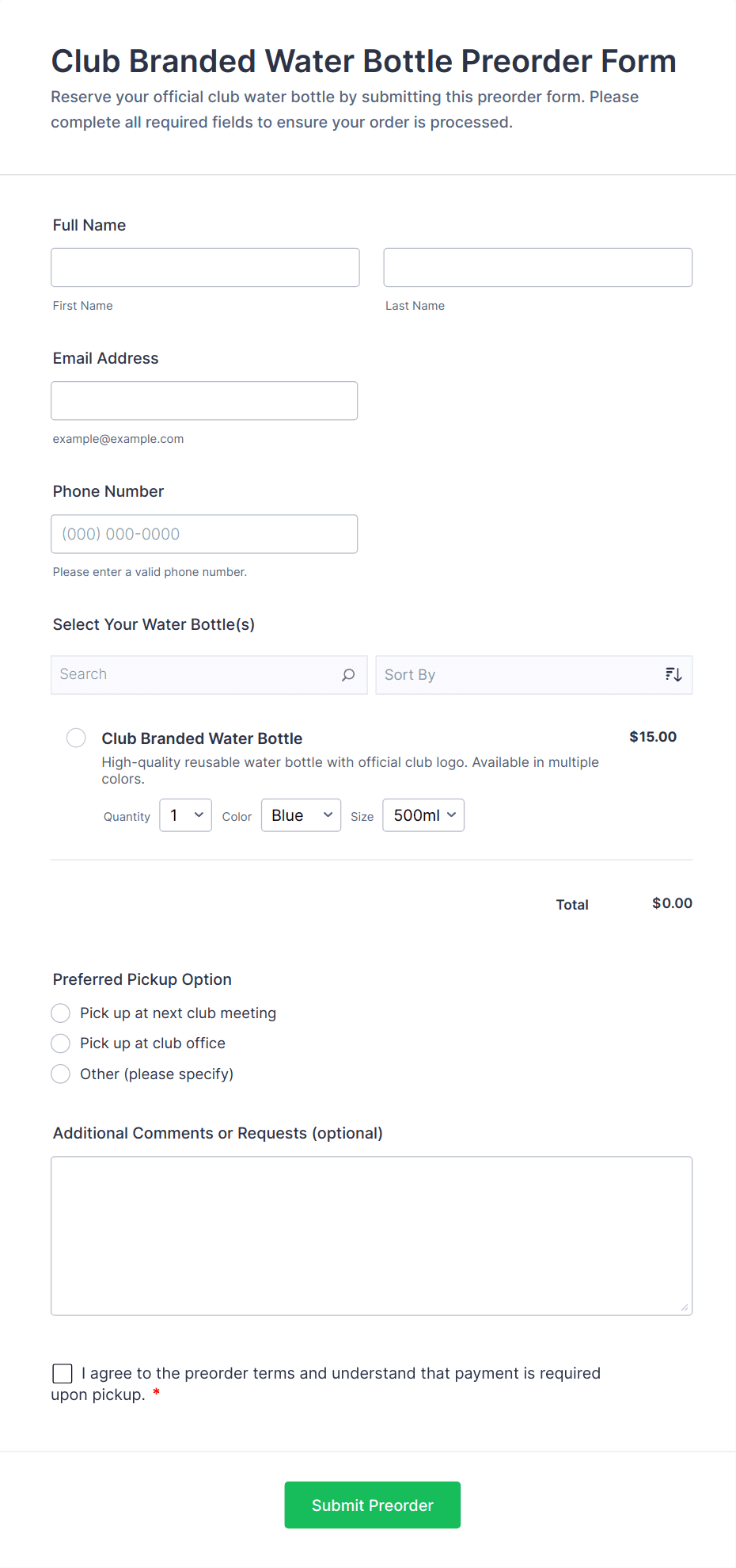 Preorder forms are specialized online forms designed to collect advance orders for products or services before they are officially released or available for general sale. Businesses, creators, and organizations use preorder forms to gauge demand, secure early sales, and streamline inventory planning for upcoming launches. These forms are commonly used for new product releases, limited-edition items, event tickets, seasonal goods, or even digital content. By allowing customers to reserve or purchase items ahead of time, preorder forms help businesses manage expectations, reduce the risk of overproduction, and build excitement around new offerings.