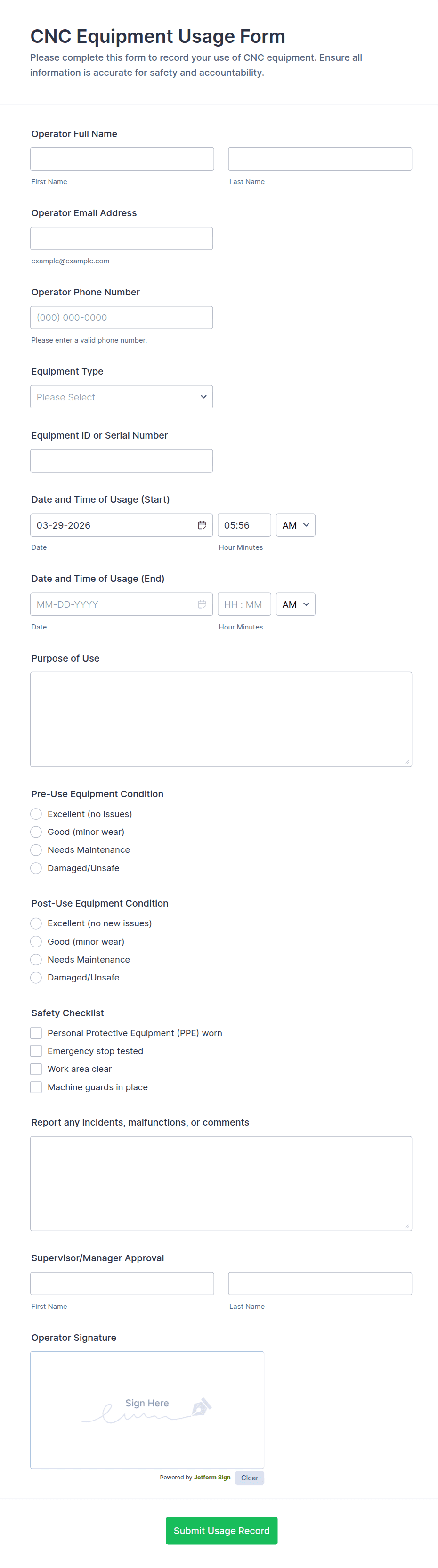 PPE Sign-Out Log Form helps safety and operations teams track issued and returned protective equipment across departments, improving accountability and recordkeeping with fast online data collection in Jotform.