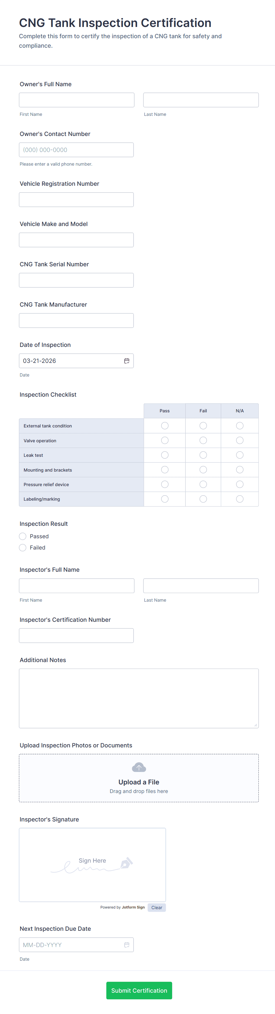 - Signature fields for inspector and/or vehicle owner