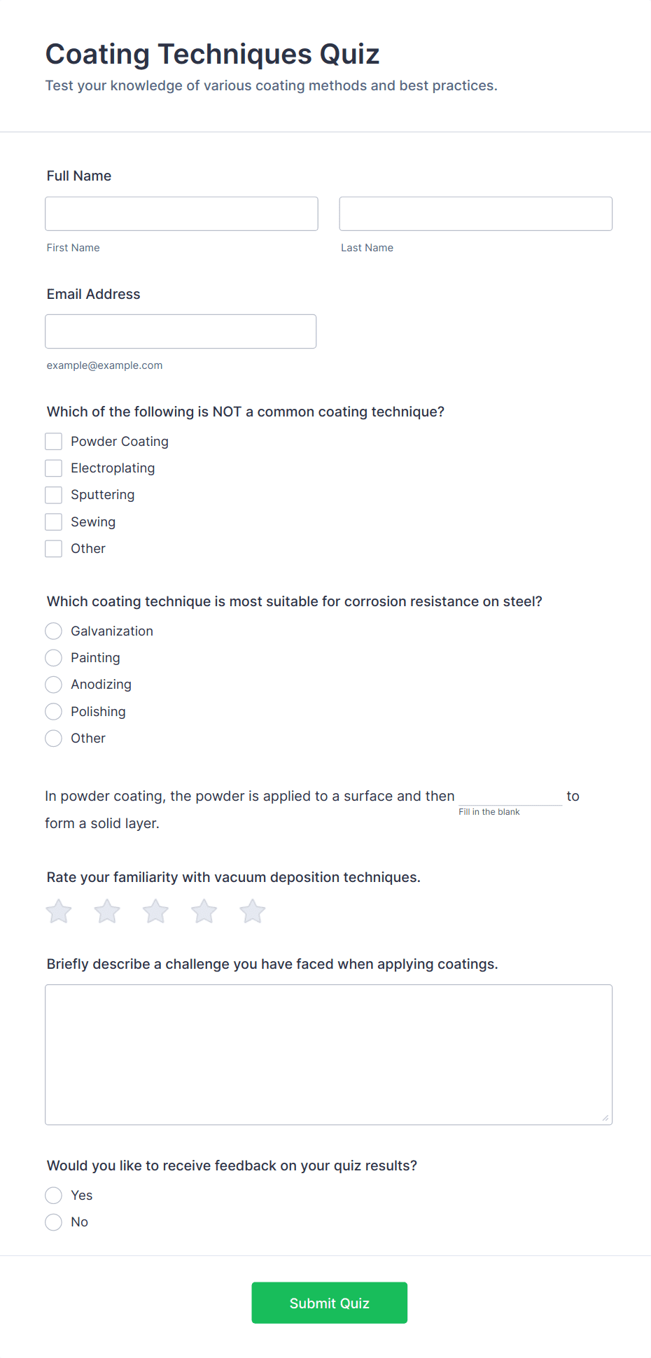 Quiz Templates are pre-designed forms specifically created to facilitate the process of building quizzes for a variety of purposes, such as education, employee training, lead generation, event engagement, and more. These templates provide a structured way to present questions, collect answers, and automatically score or evaluate responses. Whether you’re a teacher assessing student knowledge, a business running a product knowledge test, or a marketer creating a fun personality quiz, Quiz Templates offer a flexible foundation to suit your needs. They can be used for online exams, trivia games, onboarding assessments, customer feedback quizzes, and interactive learning modules.