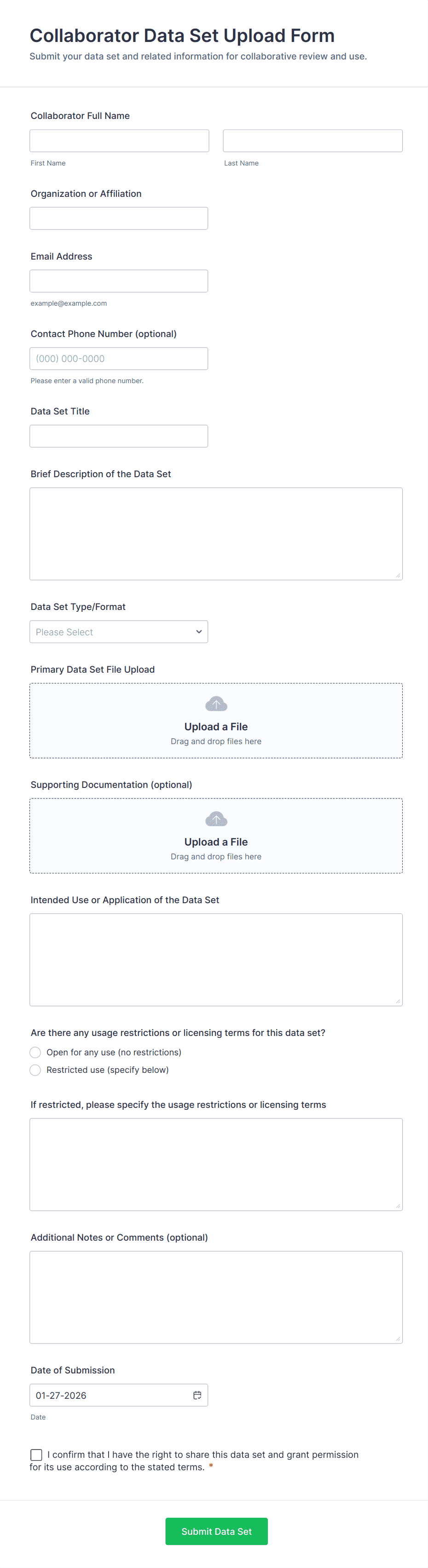 File Upload Forms are specialized online forms designed to collect files, documents, images, or other digital assets directly from users. These forms are commonly used in scenarios where individuals or organizations need to gather supporting materials, such as job applications with resumes, event registrations with ID proofs, homework submissions, design requests, or client onboarding documents. The versatility of File Upload Forms makes them essential for businesses, educational institutions, creative agencies, HR departments, and service providers who require a secure and efficient way to receive files from clients, students, or collaborators.