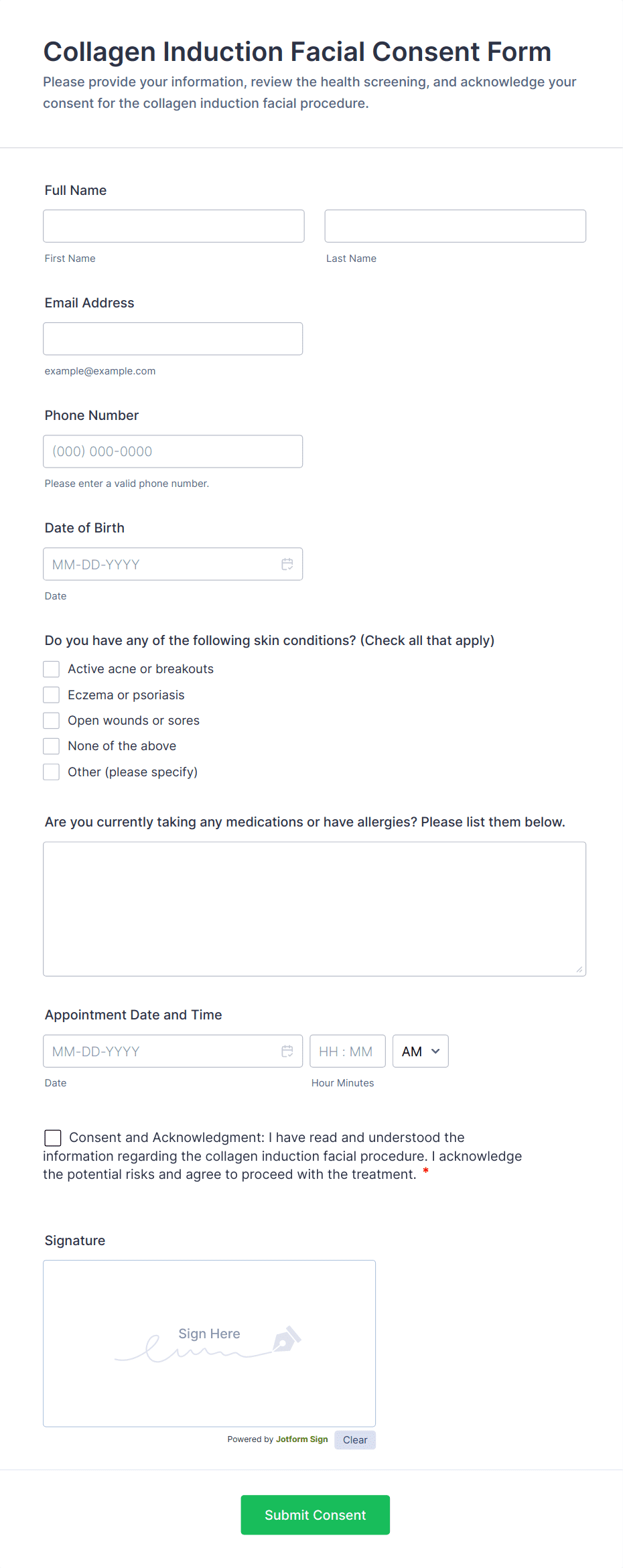 The Infusion Therapy Form is an online form that allows medical organizations to sign up patients for facial infusion therapy. Fully customizable with no coding. HIPAA friendly.