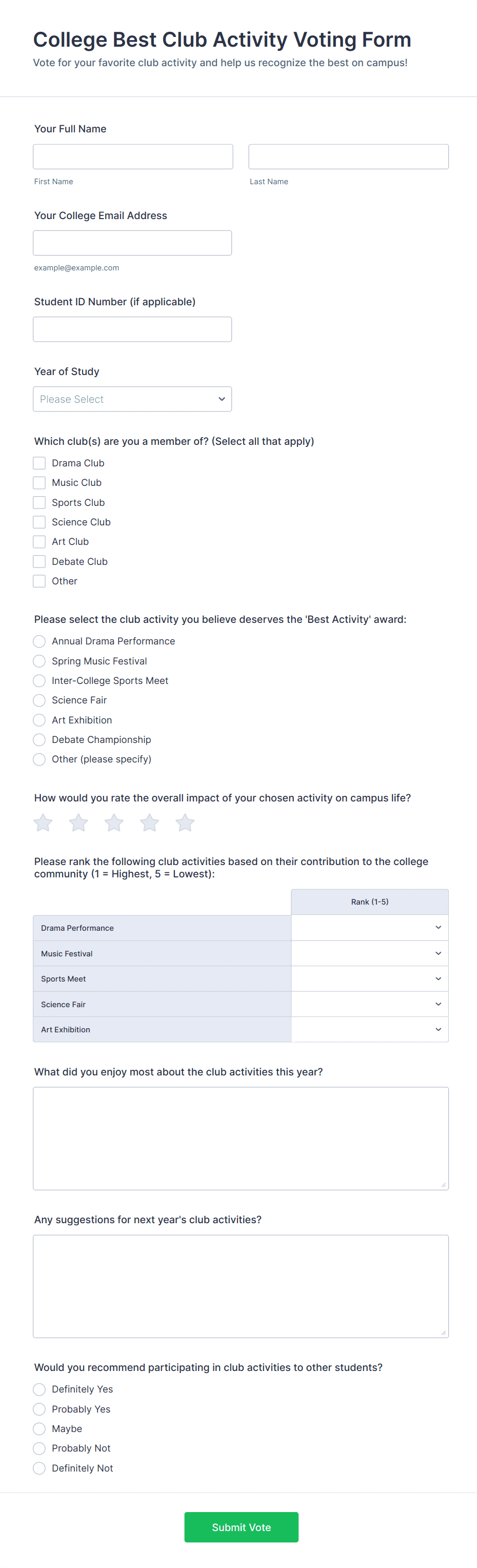 Voting forms are digital tools designed to collect, organize, and analyze votes or preferences from a group of participants. They are commonly used for elections, polls, surveys, award nominations, event planning, and decision-making processes in organizations, schools, clubs, and communities. Voting forms streamline the process of gathering input, whether it’s for selecting a new team leader, choosing a favorite project, or making group decisions efficiently. Their versatility makes them suitable for both formal elections and informal opinion polls, ensuring that every participant’s voice is heard and recorded accurately.