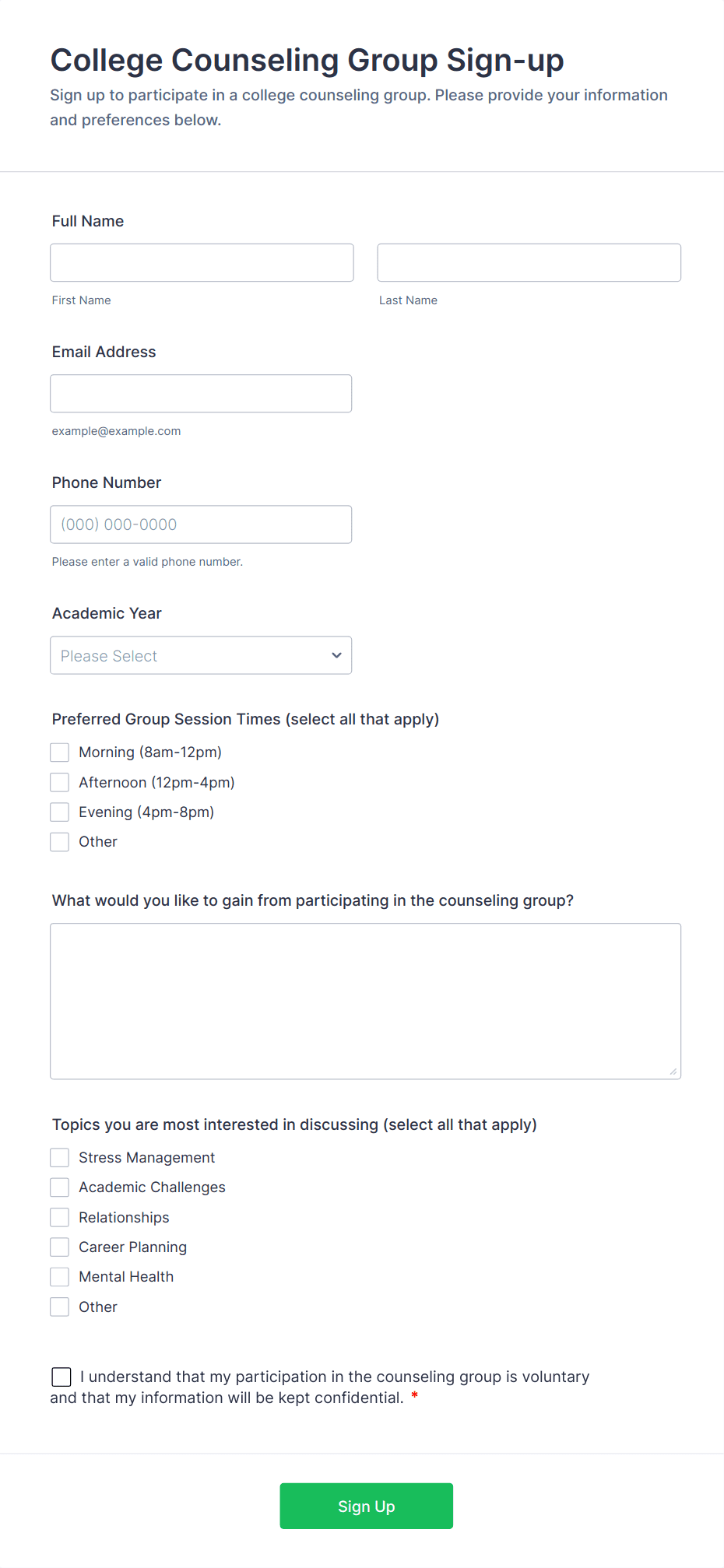 Improve your school counseling office’s workflow with powerful School Counselor Forms from Jotform. Whether you’re tracking incidents, collecting scholarship applications, or conducting behavior assessments, collect all the data you need with online forms — then manage it in a powerful database that lets you view submissions in a calendar, spreadsheet, or individual cards for every student. All of our form templates are easy to customize with our no-code builder, so you can add or remove form fields and update visual elements to create the perfect form in minutes. Make the switch from paper forms to online forms and get organized with online School Counselor Forms.