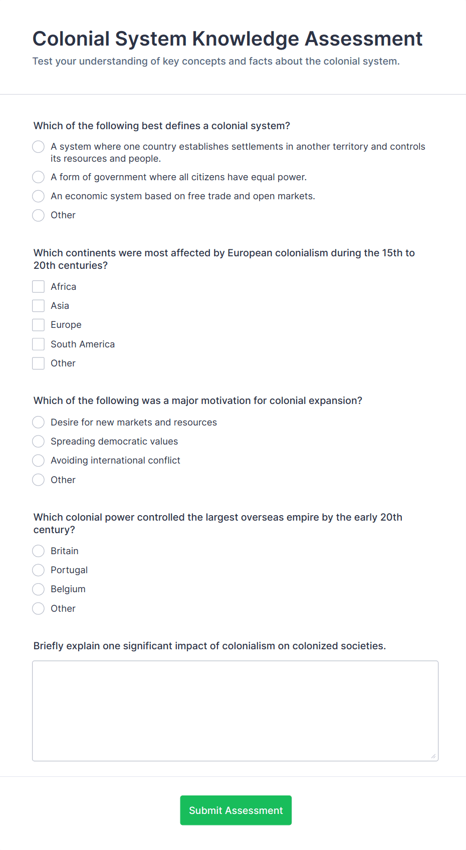 Quiz Templates are pre-designed forms specifically created to facilitate the process of building quizzes for a variety of purposes, such as education, employee training, lead generation, event engagement, and more. These templates provide a structured way to present questions, collect answers, and automatically score or evaluate responses. Whether you’re a teacher assessing student knowledge, a business running a product knowledge test, or a marketer creating a fun personality quiz, Quiz Templates offer a flexible foundation to suit your needs. They can be used for online exams, trivia games, onboarding assessments, customer feedback quizzes, and interactive learning modules.