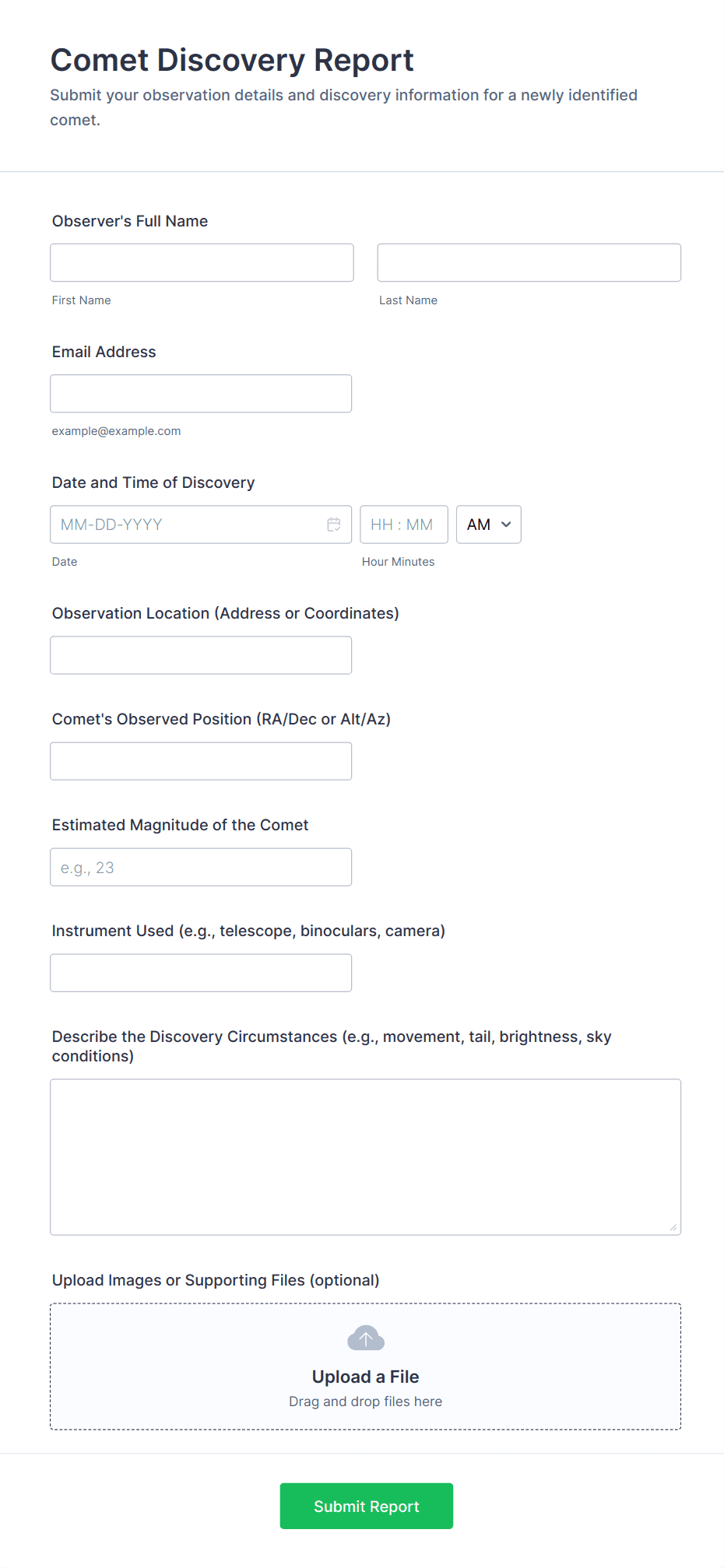 • For business reports: Include fields for dates, metrics, comments, and file uploads.