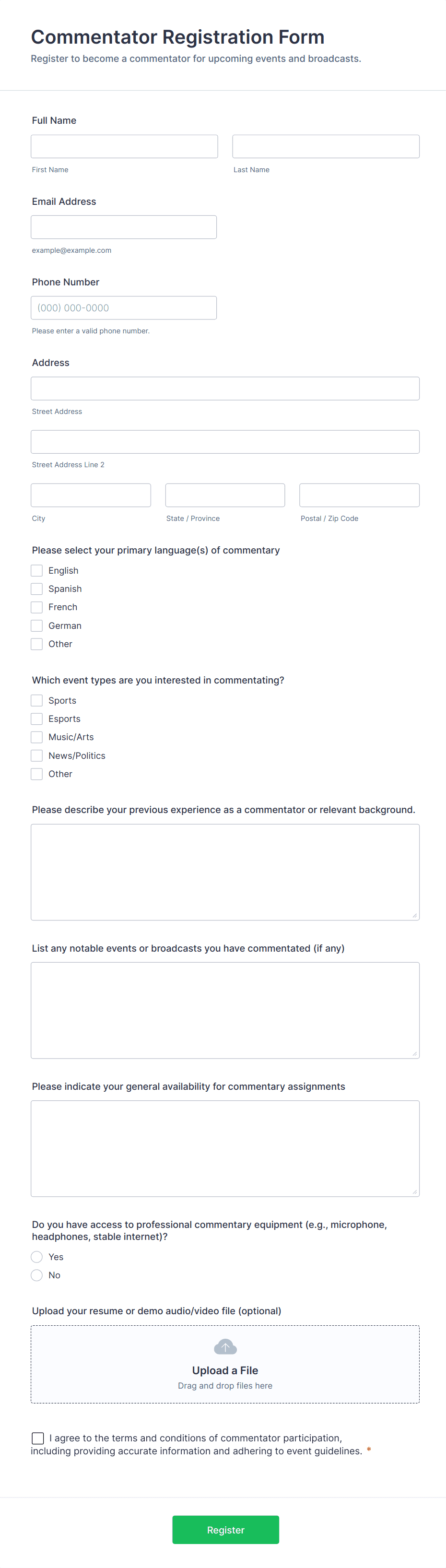 Event Registration Forms are digital tools designed to streamline the process of collecting attendee information for a wide variety of events, such as conferences, workshops, webinars, fundraisers, classes, and social gatherings. These forms allow organizers to gather essential details like participant names, contact information, payment preferences, dietary restrictions, and session selections. By using event registration forms, event planners can efficiently manage RSVPs, track attendance, and ensure a smooth check-in process on the day of the event. The flexibility of these forms makes them suitable for both small private gatherings and large-scale public events, adapting to the unique requirements of each occasion.