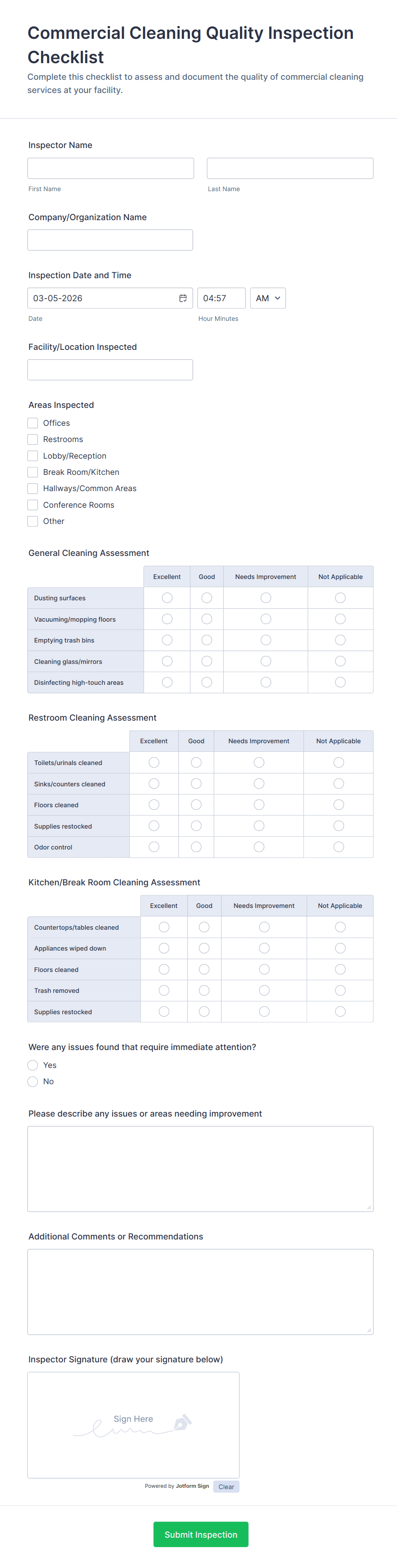 Cleaning Forms are specialized digital forms designed to streamline and organize the processes involved in cleaning services, facility maintenance, and janitorial operations. These forms can be used for a variety of purposes, such as scheduling cleaning appointments, conducting cleaning inspections, tracking supply usage, logging completed tasks, and collecting client feedback. Whether you manage a commercial cleaning company, oversee in-house custodial teams, or offer residential cleaning services, Cleaning Forms help ensure that all tasks are documented, standards are met, and communication between staff and clients remains clear and efficient.