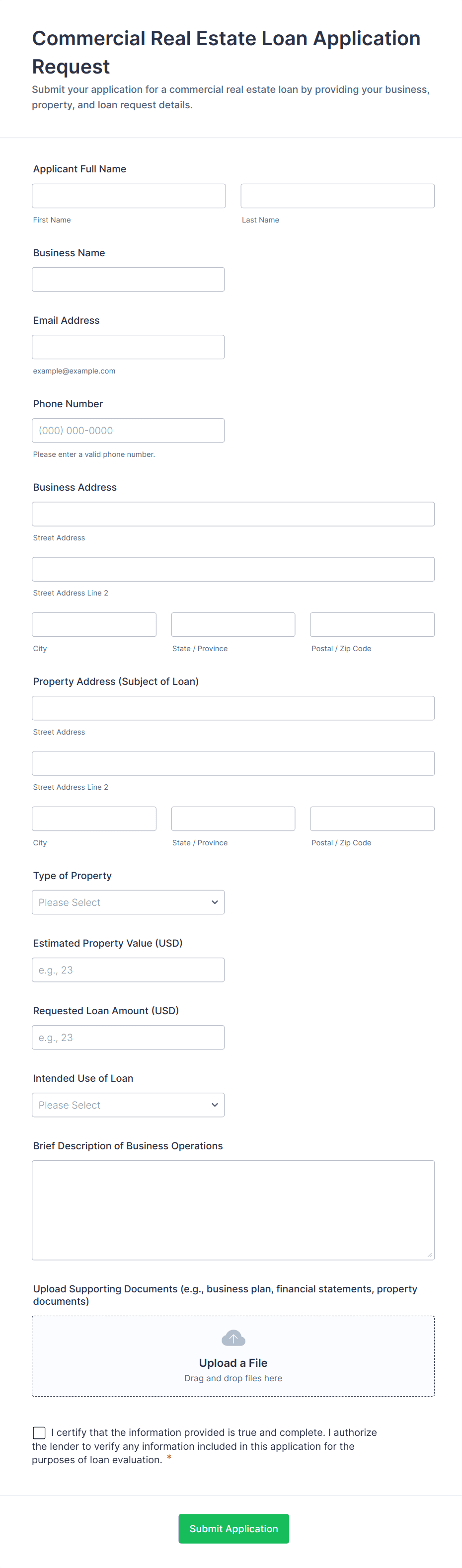 For business loans, include fields for business name, type, financial statements, and tax ID. For mortgage or auto loans, add property or vehicle details.