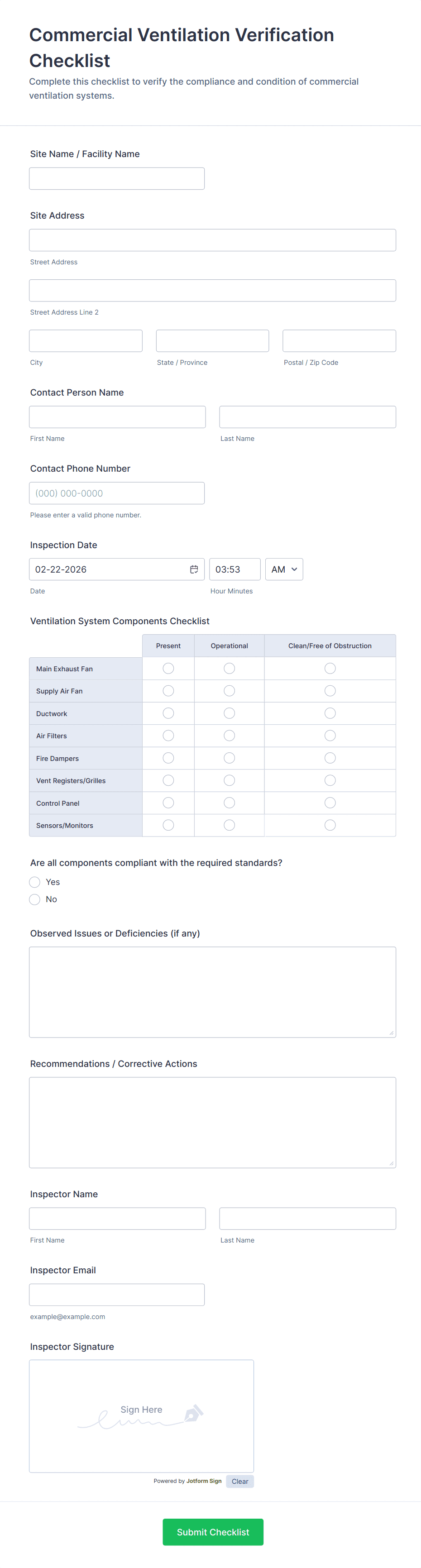 A building inspection checklist is a list of items that should be inspected while doing an inspection of a building. It is customizable with easy-to-use and drag-and-drop features of Jotform. No coding!