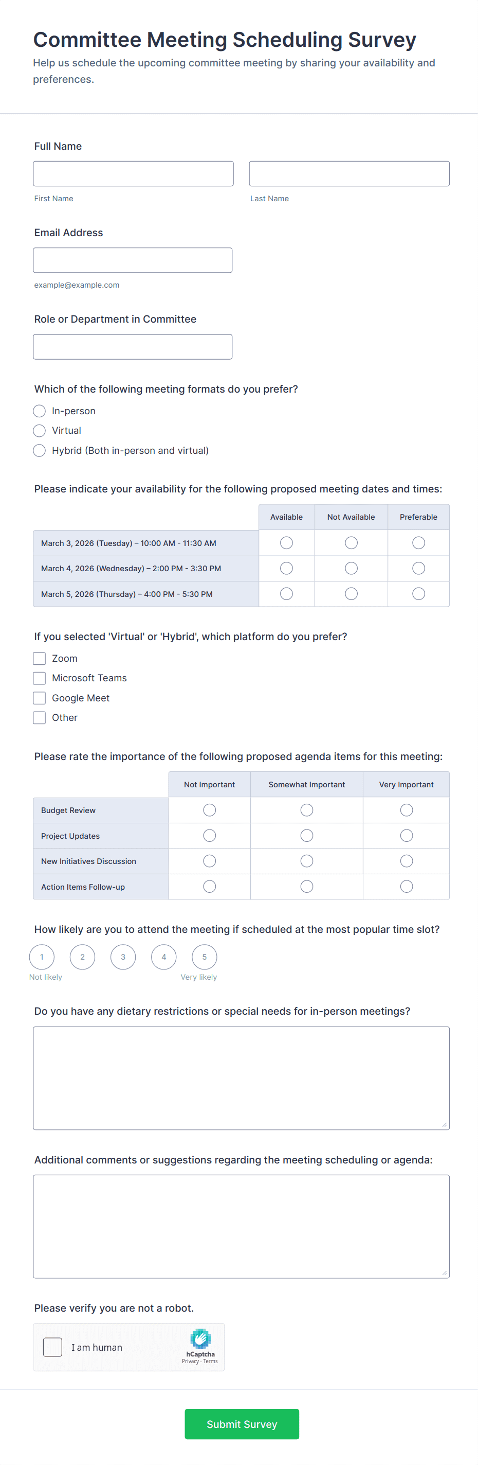 A meeting form is an online tool used to organize, schedule, and manage meetings by collecting essential information such as attendee details, agenda items, and feedback.