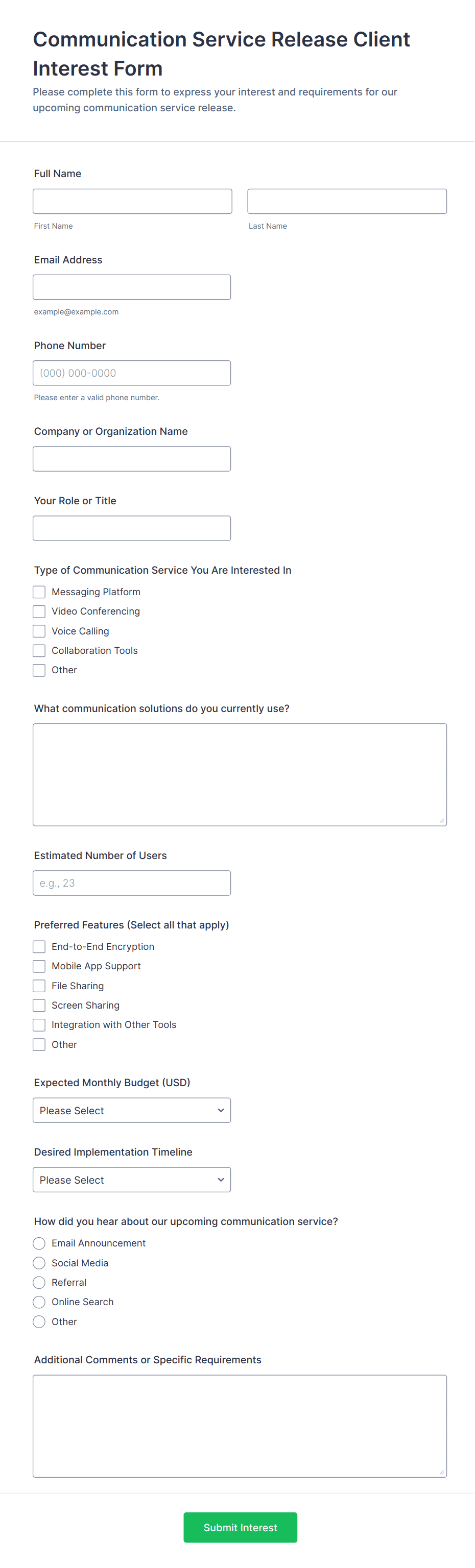 - For sales inquiries: Company Name, Contact Information, Product/Service Interest, Budget, Timeline