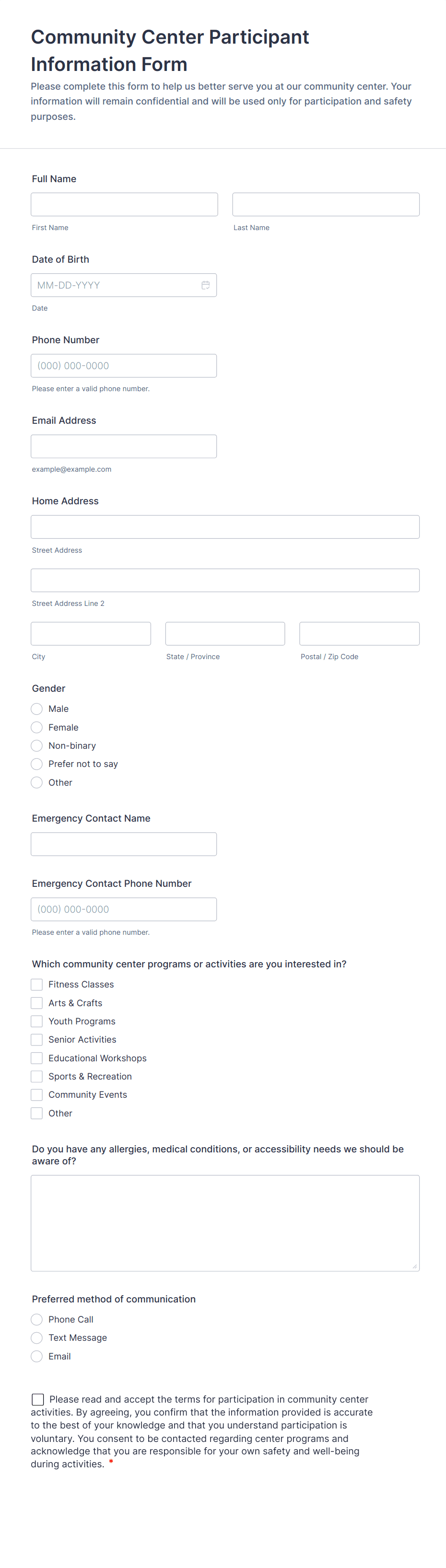 Information Form Templates are versatile digital forms designed to collect, organize, and manage a wide range of data from users, clients, or employees. These templates are commonly used for gathering personal details, contact information, feedback, preferences, or any other type of structured data required for business, educational, healthcare, or event-related purposes. Whether you need to onboard new clients, register participants for an event, collect feedback, or simply update records, information forms streamline the process by providing a standardized and efficient way to capture essential details.