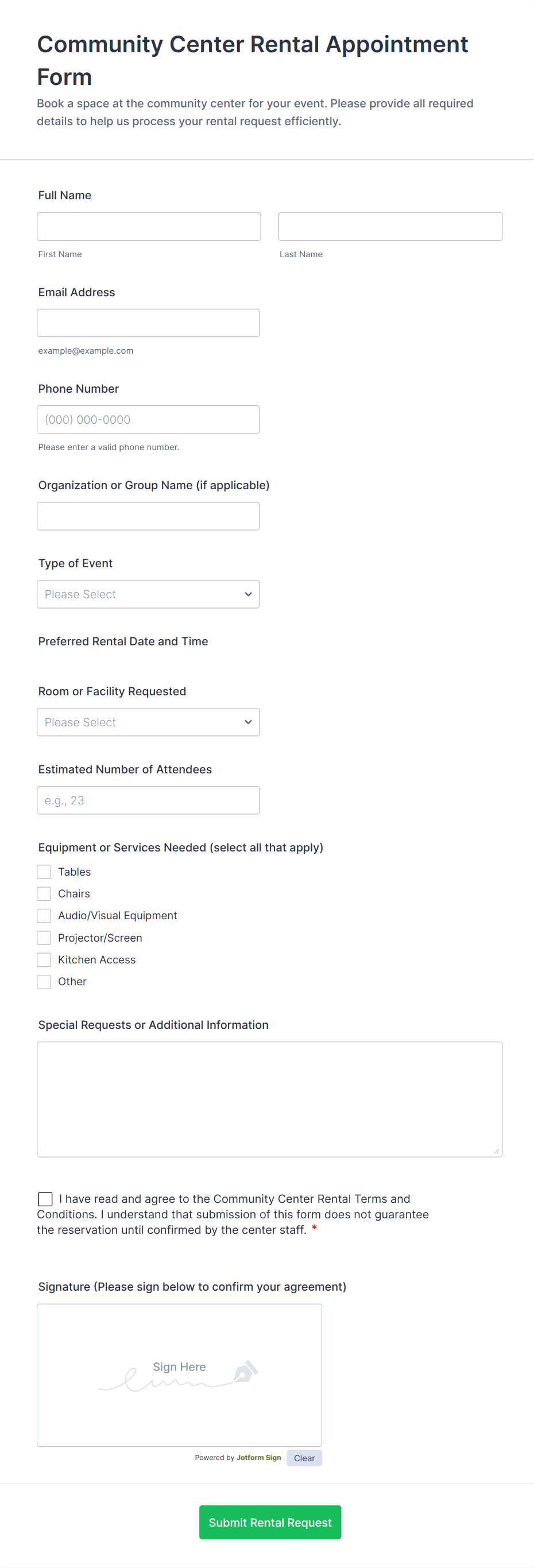 The form templates here are for informational purposes only. Jotform is not providing legal, financial, or other advice, or implying that the forms are legally valid in all or any jurisdictions. Before using any such form, consult an attorney and/or other applicable professionals to make sure that the form meets your needs, legally and otherwise.