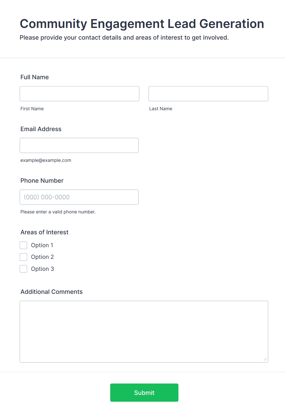 Lead generation forms are specialized online forms designed to capture valuable information from potential customers, clients, or prospects. These forms are commonly used by businesses and organizations to collect contact details, preferences, and other relevant data that can be used to nurture leads and drive sales or engagement. Typical use cases include newsletter sign-ups, event registrations, quote requests, demo bookings, and gated content downloads. By strategically placing lead generation forms on websites, landing pages, or social media, organizations can efficiently gather high-quality leads and streamline their marketing and sales processes.