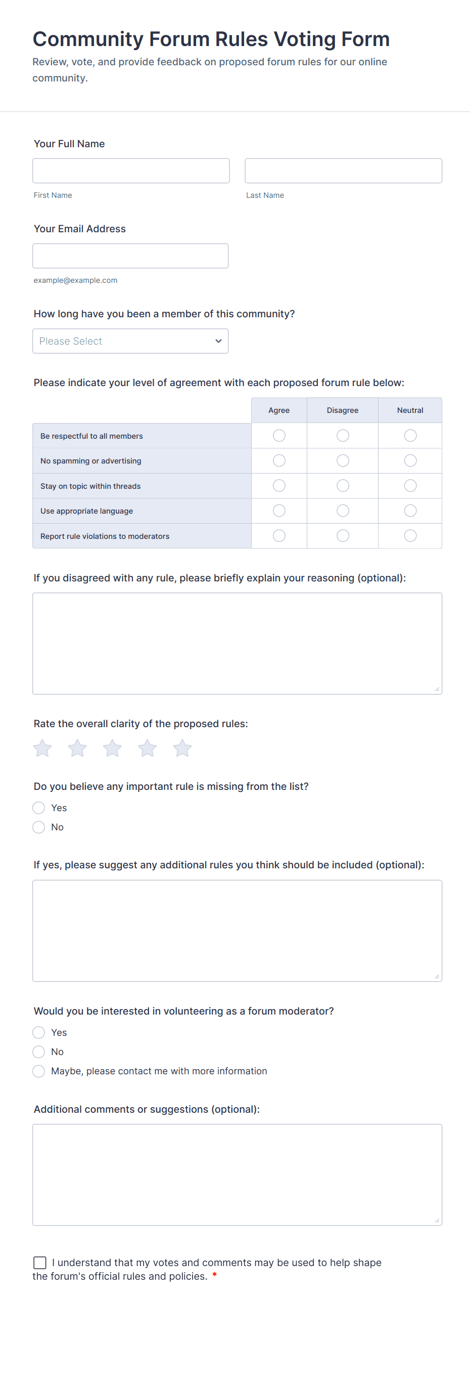Voting forms are digital tools designed to collect, organize, and analyze votes or preferences from a group of participants. They are commonly used for elections, polls, surveys, award nominations, event planning, and decision-making processes in organizations, schools, clubs, and communities. Voting forms streamline the process of gathering input, whether it’s for selecting a new team leader, choosing a favorite project, or making group decisions efficiently. Their versatility makes them suitable for both formal elections and informal opinion polls, ensuring that every participant’s voice is heard and recorded accurately.