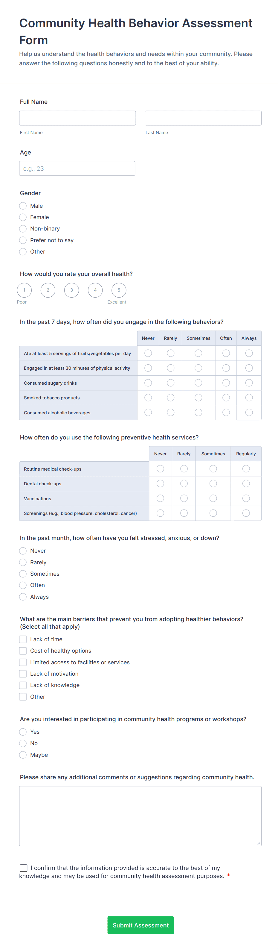 Healthcare assessment forms are structured documents used to collect and evaluate patient health information to support clinical decisions, care planning, and ongoing monitoring. They help healthcare teams capture consistent details about symptoms, medical history, risk factors, functional status, and care needs in a clear and organized way. Healthcare assessment forms are commonly used in clinics, hospitals, telehealth services, rehabilitation centers, home care, and specialty practices for intake assessments, screening evaluations, follow-up check-ins, and condition monitoring. By standardizing assessment workflows, these forms improve documentation quality, reduce missing information, and support safer, more coordinated care.