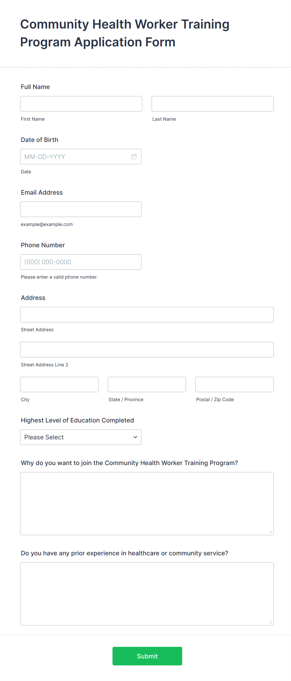 • For job applications, include fields for personal information, education, work experience, references, and file uploads for resumes or cover letters.