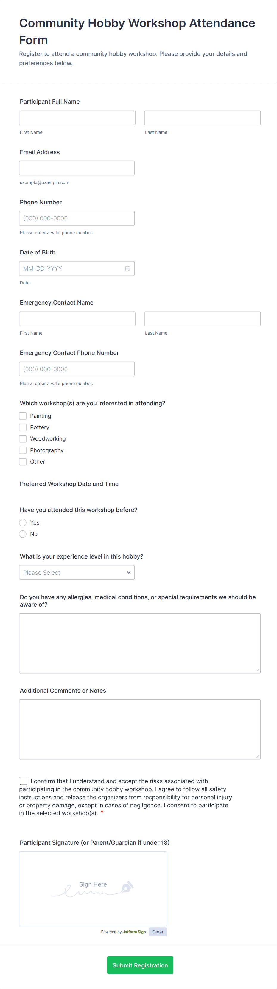 Workshop Registration Form Templates are specialized online forms designed to streamline the process of enrolling participants in workshops, seminars, training sessions, and educational events. These templates help organizers efficiently collect essential attendee information such as names, contact details, session preferences, payment details, and special requirements. Whether you’re hosting a hands-on art class, a professional development seminar, or a multi-day technical workshop, these forms can be tailored to fit the unique needs of your event. Use cases range from small community workshops to large-scale industry conferences, making them versatile tools for educators, trainers, event planners, and organizations of all sizes.