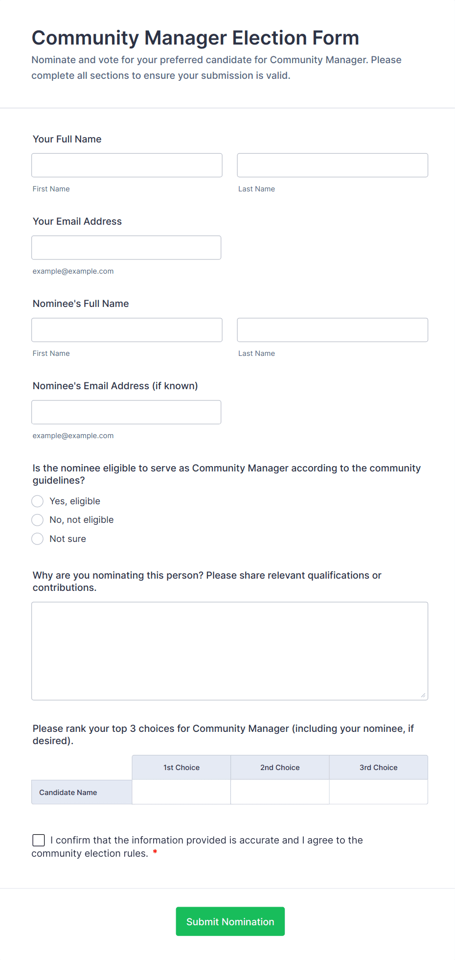 Voting forms can be adapted to a variety of situations, each with unique requirements and benefits. Here’s how they can be used, who might use them, and how their structure can differ: