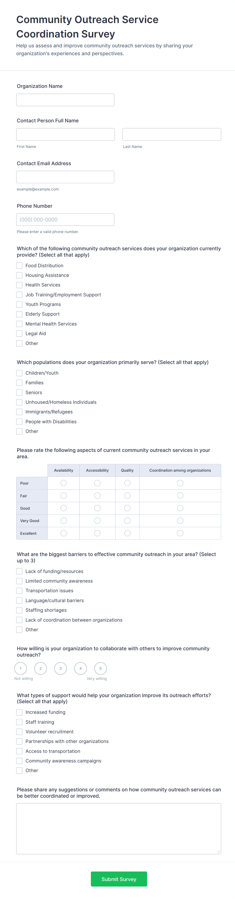 Survey templates are pre-designed forms that help individuals and organizations collect feedback, opinions, or data from a target audience. These templates are widely used for a variety of purposes, such as customer satisfaction surveys, employee engagement assessments, market research, event feedback, and academic studies. By providing a structured set of questions, survey templates streamline the process of gathering valuable insights, making it easier to analyze trends, measure satisfaction, and make informed decisions. Whether you’re a business owner, HR professional, educator, or researcher, survey templates offer a quick and effective way to reach your audience and collect actionable information.