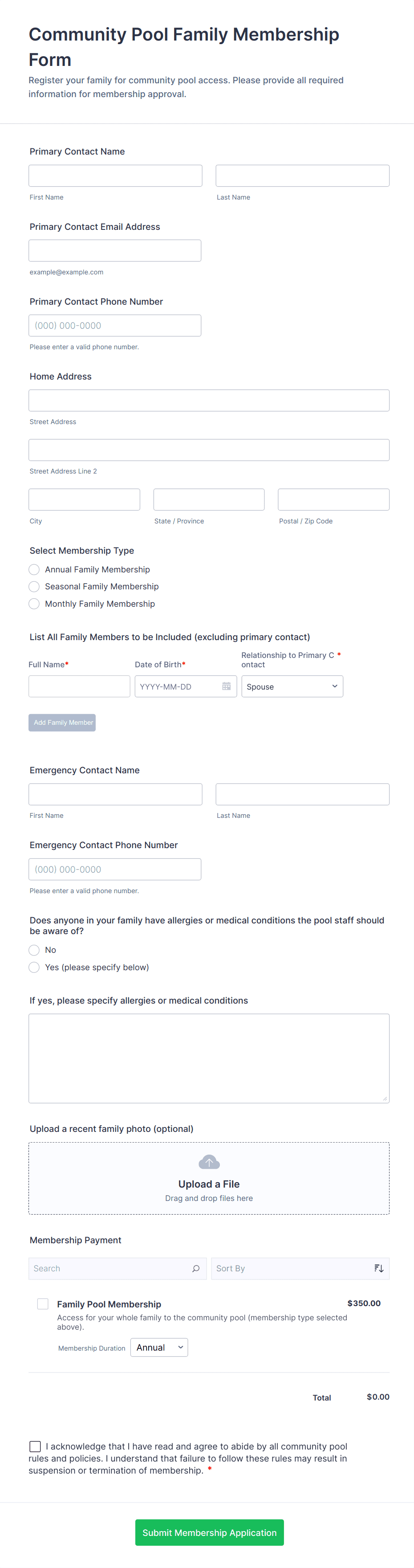 Membership Registration Forms are essential tools for organizations, clubs, associations, gyms, and other groups that require individuals to sign up and become members. These forms are designed to collect vital information from prospective members, such as contact details, membership preferences, payment information, and consent to terms and conditions. Whether you’re managing a professional association, a sports club, a nonprofit, or an online community, membership registration forms streamline the onboarding process, ensure accurate data collection, and help maintain organized member records. Use cases range from annual club sign-ups and event-based memberships to recurring subscription services and exclusive access programs.