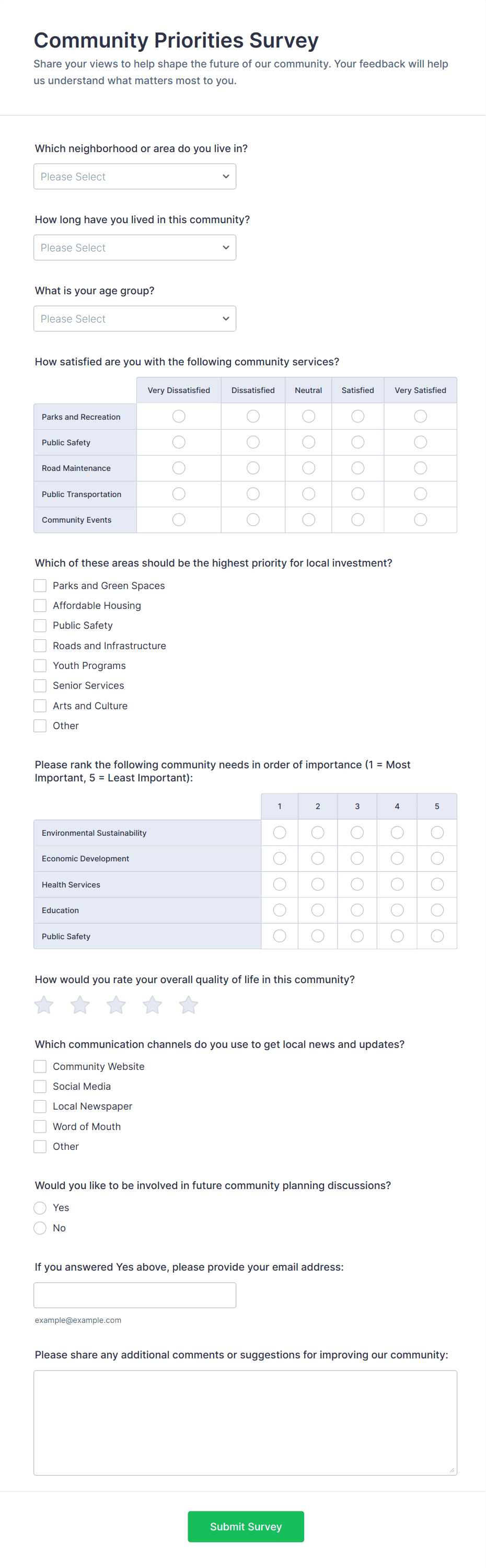 A community service survey is a questionnaire used by non-profit organizations to assess volunteerism and community engagement. No coding is required to customize this template!