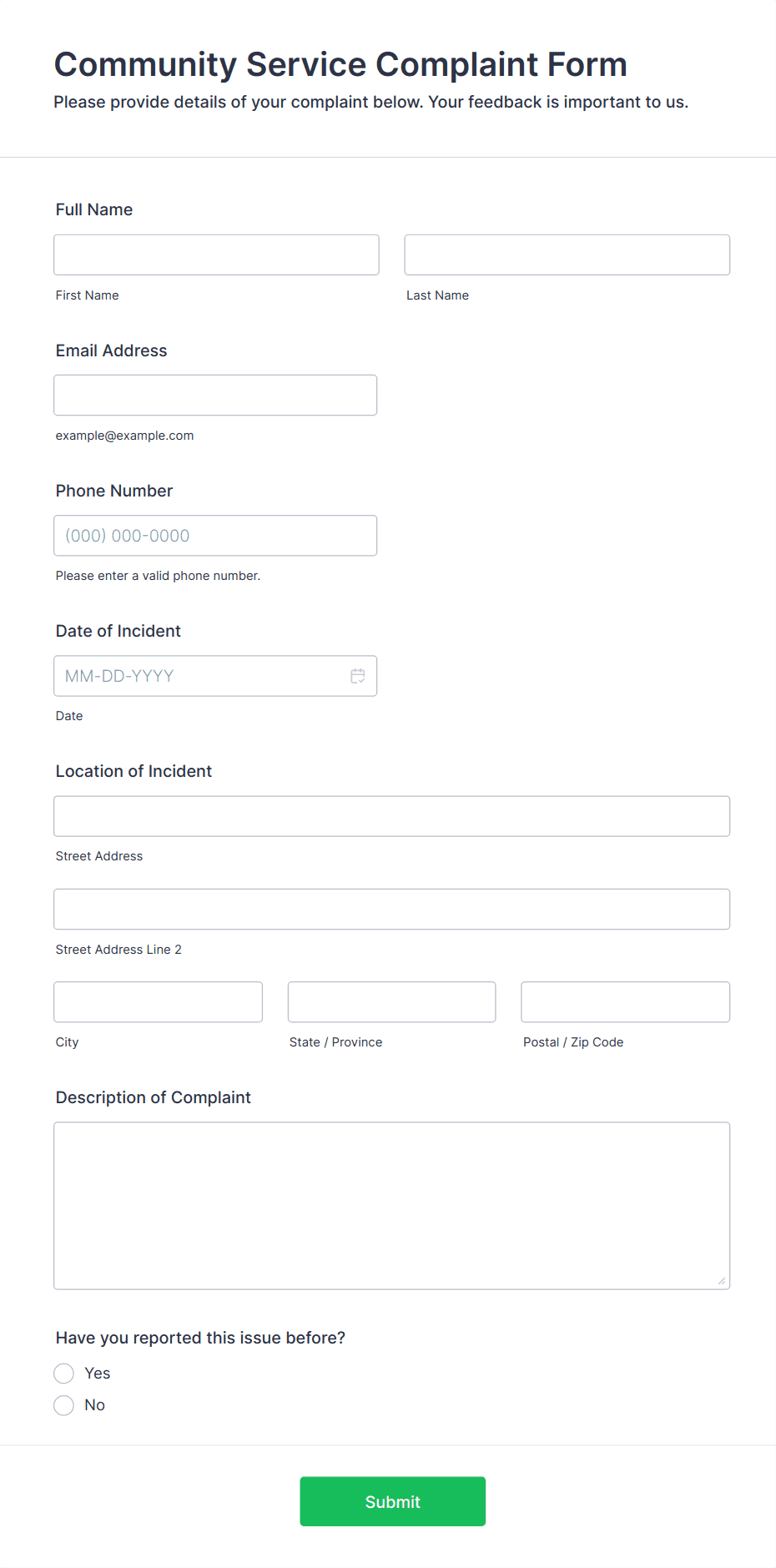 • Use conditional logic to show or hide fields based on user responses (e.g., display additional questions if the complaint is about a specific service).