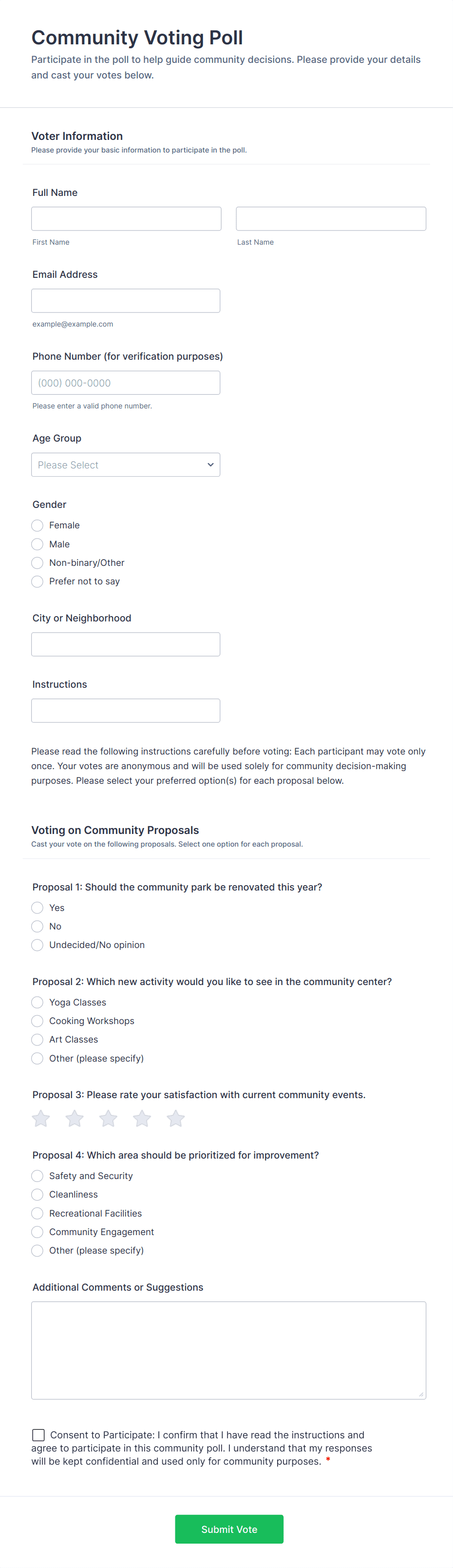 Voting forms may collect voter identification (if not anonymous), selected options or candidates, additional comments, and sometimes security verification details.