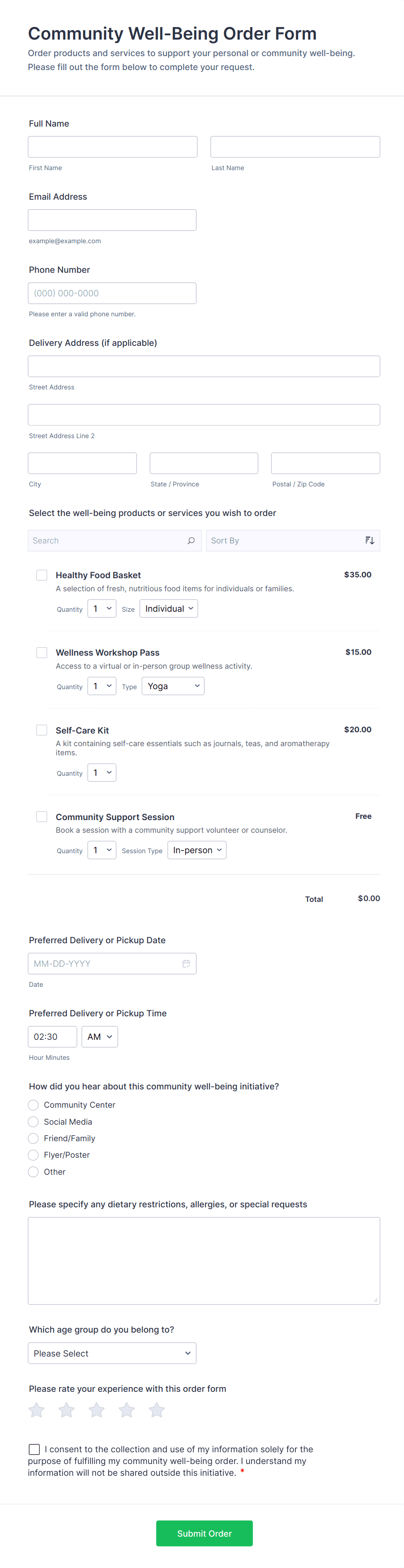 Wellness forms are digital tools designed to collect, track, and manage information related to personal health, well-being, and lifestyle habits. These forms are commonly used by wellness coaches, fitness trainers, healthcare providers, corporate wellness programs, and individuals to monitor aspects such as nutrition, exercise routines, mental health status, sleep patterns, and stress levels. Wellness forms can serve a variety of purposes, including health assessments, daily check-ins, goal tracking, consent collection, and feedback gathering. Their flexibility makes them suitable for use in gyms, clinics, schools, workplaces, and wellness retreats, helping both professionals and individuals stay informed and proactive about health and wellness.